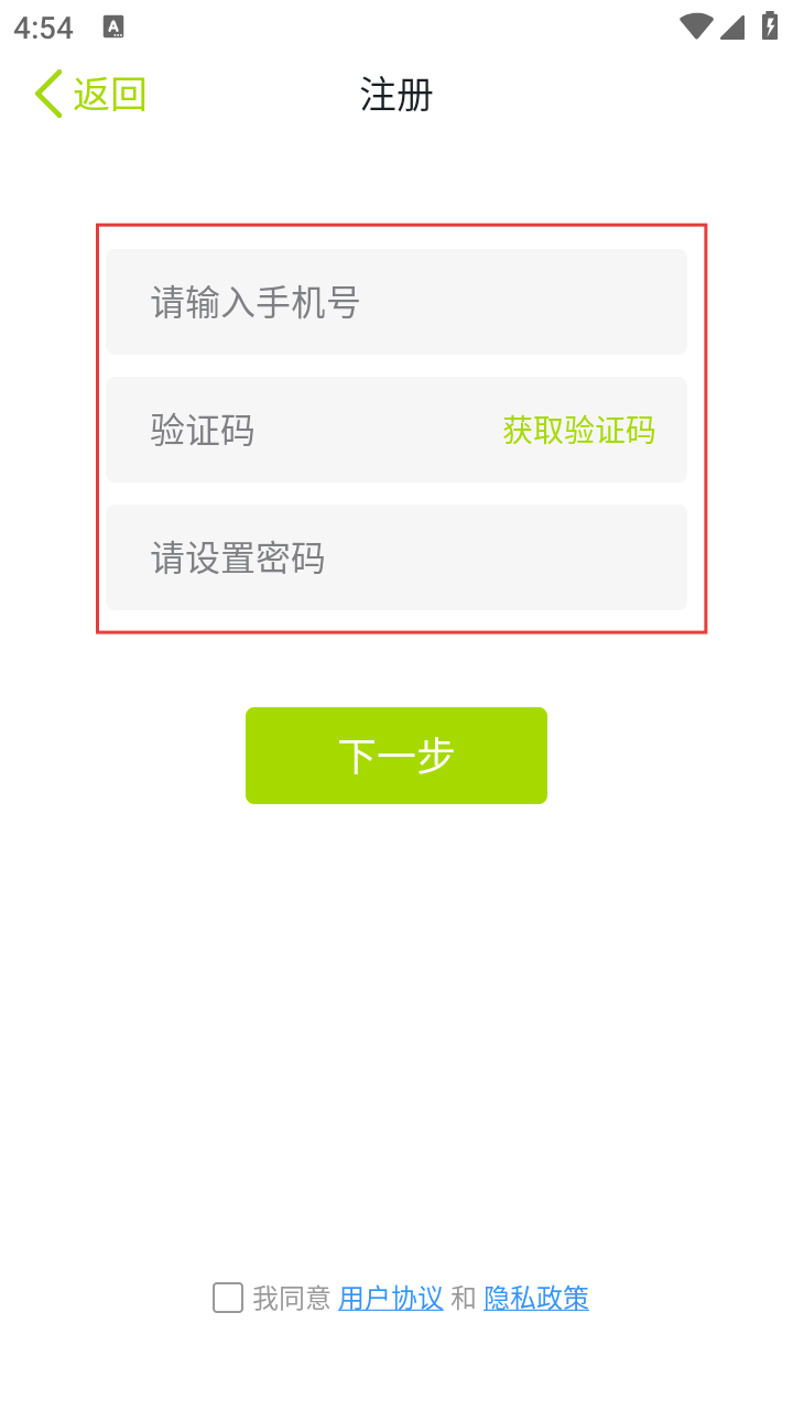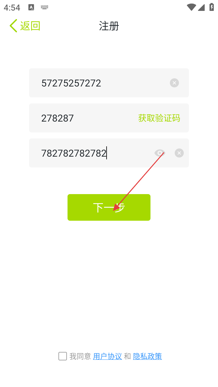 4、勾选页面底部【我同意用户协议和隐私政策】选项,最后点击【下一步】按钮,完成整个注册操作。