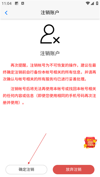 4、在注销账户页面,确认相关提示后,点击【确定注销】完成账号注销操作。