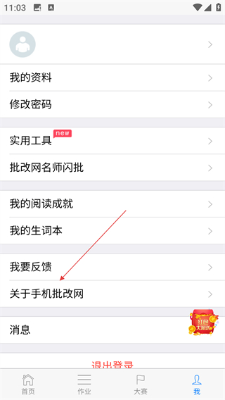 2、在个人中心页面,找到【关于手机批改网】选项,点击进入相关页面。
