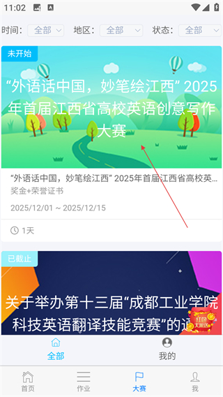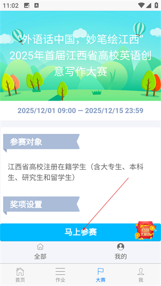 2、在大赛板块找到写作大赛入口,点击进入活动详情页。