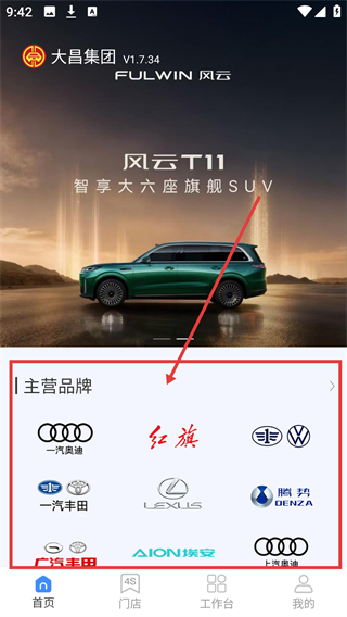 1. 于首页点击【主营品牌】,即可进入品牌列表界面,在此界面能够查看各品牌门店。