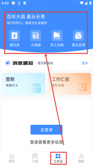 4、轻点【工作台】,随即进入工作台界面,在这里你能够运用通讯录、大昌报等功能,就此开启办公之旅。