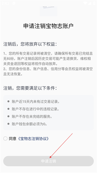 4、在申请注销页面确认满足注销条件后,勾选同意《宝物志注销协议》并点击【申请注销】完成账户注销。
