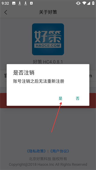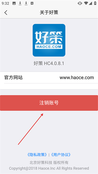 3、当进入【关于好策】页面时,点击页面上的【注销账号】按钮。