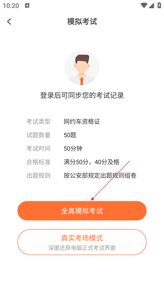 2、在模拟考试设置页面,点击【全真模拟考试】按钮,进入考试答题页面。