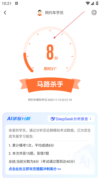 4、答题完成后,可查看考试成绩、用时及试卷分析,了解学习情况。