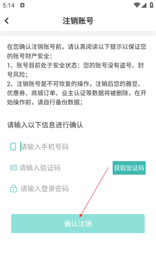 4、前往注销账号页面,依次填入手机号码、验证码以及登录密码,随后点击【确认注销】,即可完成账号注销操作。