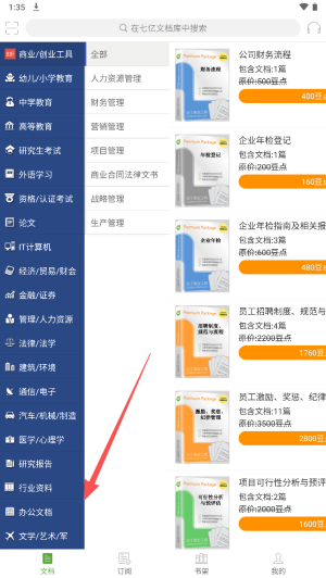 4、在分类界面,点击左侧的分类,浏览不同类别的文档资源。