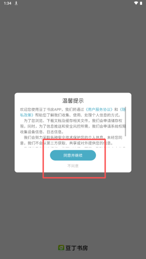 1、首次使用时,点击“同意并继续”按钮,同意用户服务协议和隐私政策。
