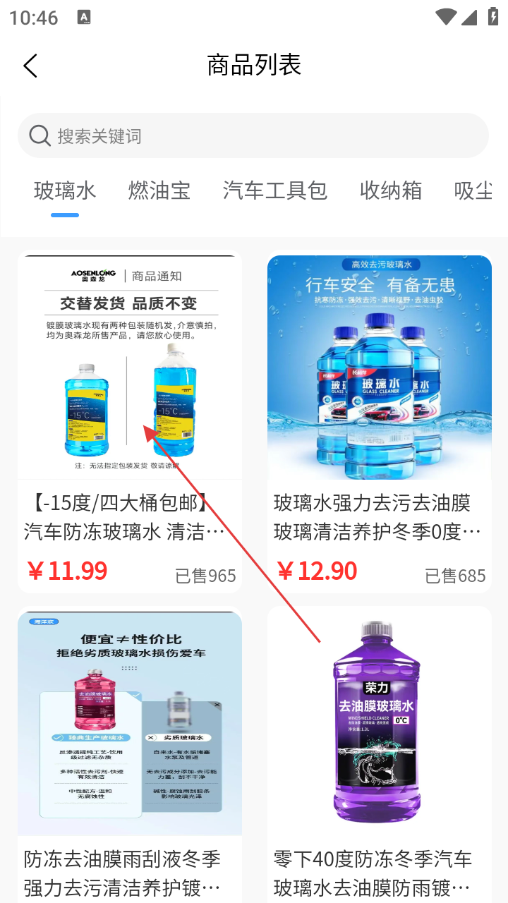 2、进入玻璃水商品列表页面,选择心仪的玻璃水商品,如【-15度/四大桶包邮】汽车防冻玻璃水。