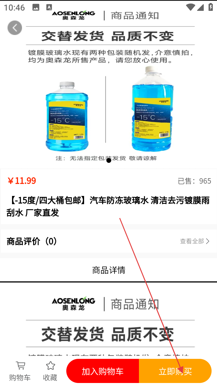3、进入所选玻璃水商品详情页后,点击【立即购买】按钮。