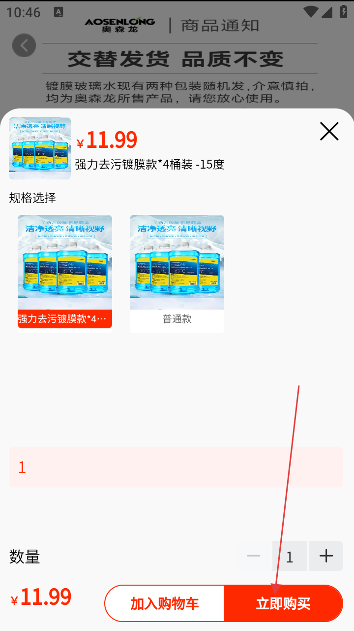4、在弹出的规格选择弹窗中,选好玻璃水规格和数量,再次点击【立即购买】按钮,即可完成购买。
