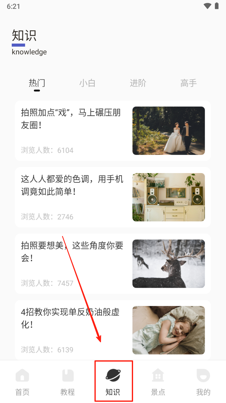 3、在“知识”页面中,查看热门摄影知识,学习如何拍出更美的照片。
