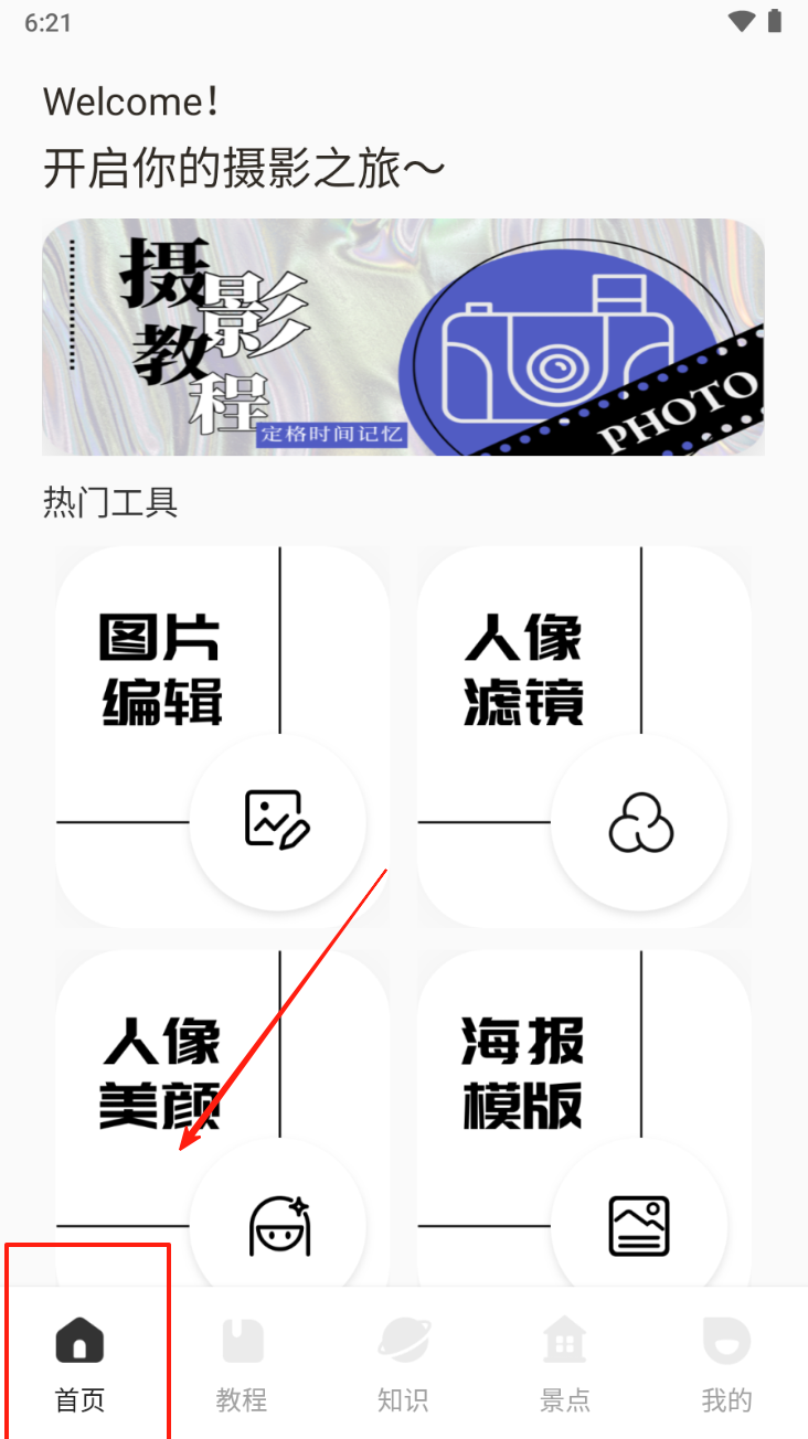 2、点击底部导航栏中的“教程”选项,浏览热门摄影教程,提升你的摄影技巧。