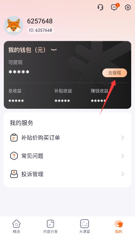 3、进入个人中心页面,选择去提现功能进入钱包界面,按要求提交提现申请即可完成操作。