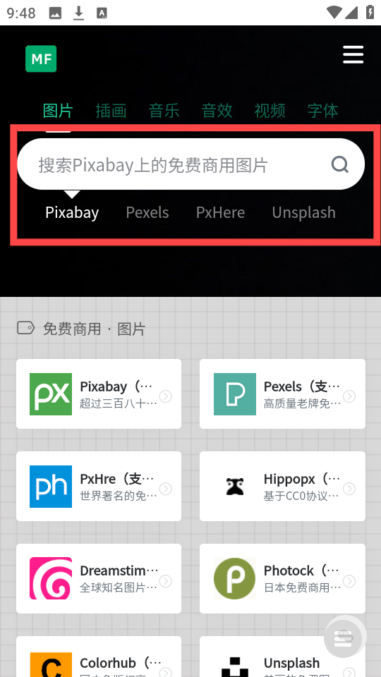 3、在顶部搜索栏输入关键词,比如要查找pixabay上免费商用的图片资源时就可如此操作。