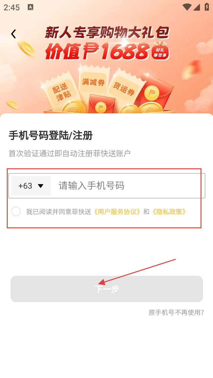 4、注册/登录时,填【手机号码】,勾选协议点【下一步】。