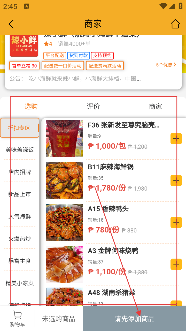 3、进商家页,选商品点右侧【+】,添加至购物车,准备结算。