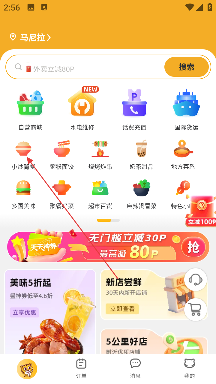 1、打开应用,在首页点【小炒简餐】,进入商家页。