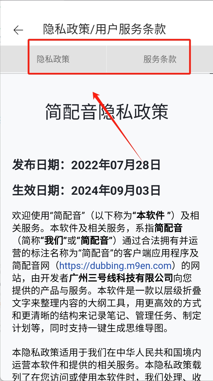 3、查看简配音隐私政策,确保了解相关条款。点击“隐私政策”可查看详细内容。