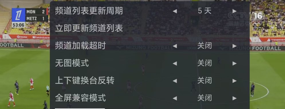 4.功能设置:按菜单键可切换画面比例(16:9或4:3),画面固定高清,还能查看时间、网速、源链接、收藏,点击齿轮进入更多设置(默认设置通常无需更改)。