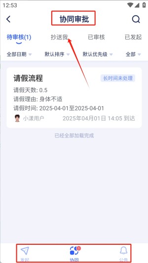 2、点击“协同审批”图标,进入审批流程页面,查看待审批的请假流程,并进行审批操作。