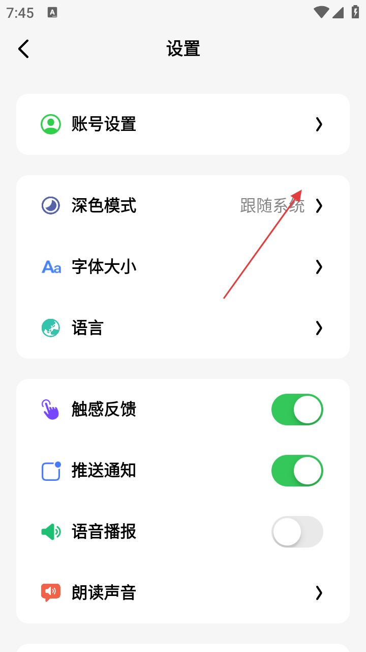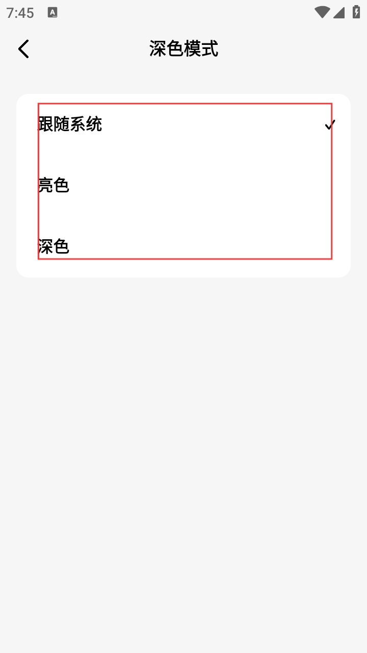 3、在设置界面中,点击【深色模式】选项,进入深色模式设置界面,可选择“跟随系统”“亮色”“深色”三种模式。