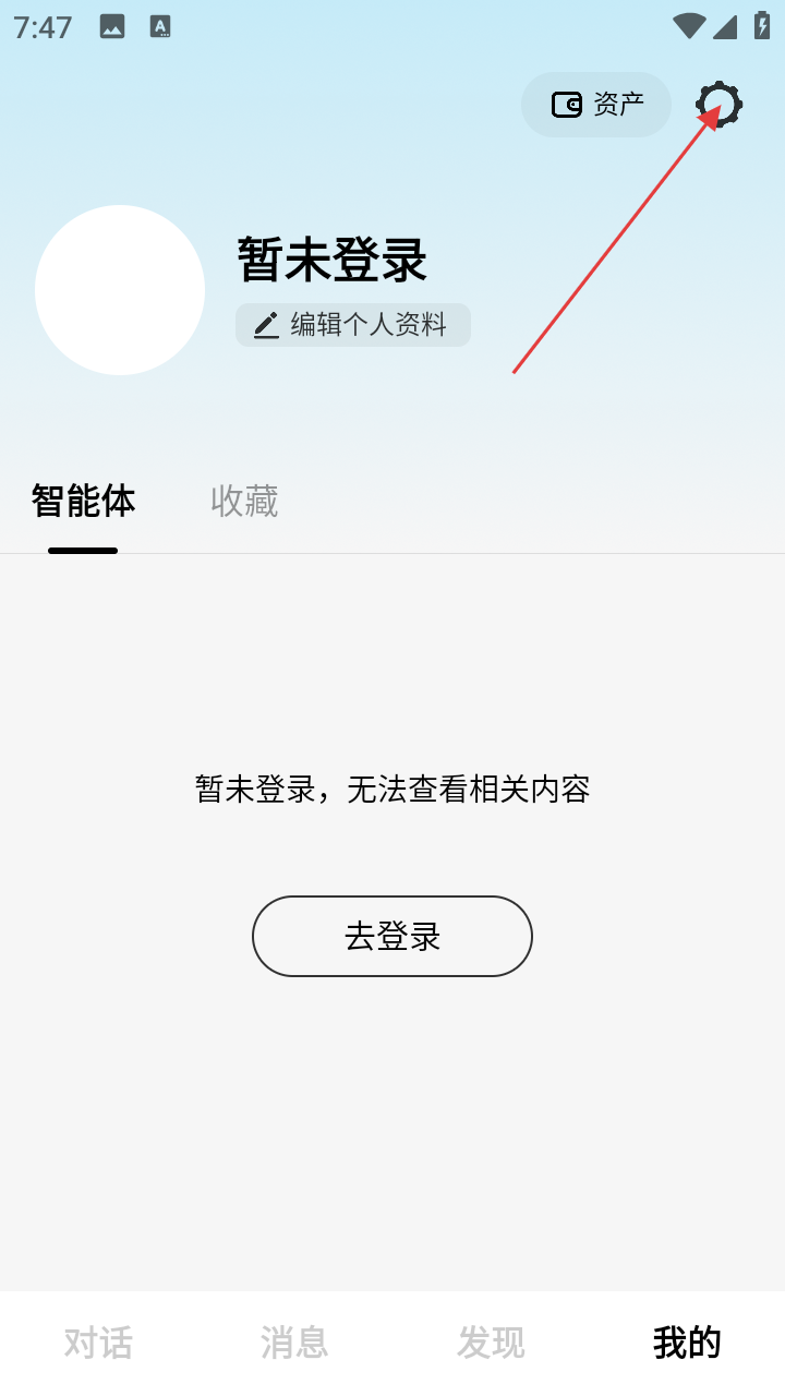 1、在对话界面,点击右下角【我的】按钮,进入个人中心,可查看登录状态、功能设置等入口。