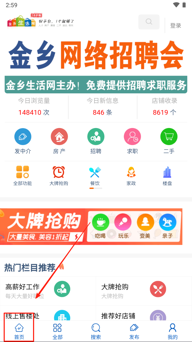 1、点击“首页”按钮,浏览金乡生活网提供的各类服务和信息。