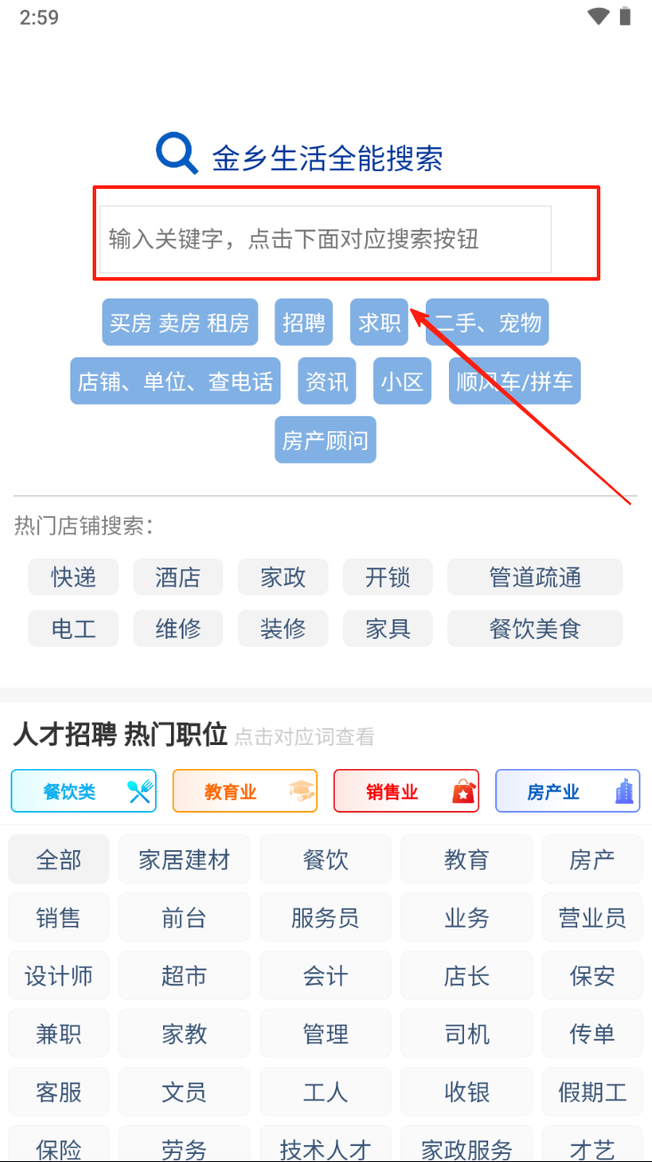 2、点击“热门功能”区域,选择您需要的服务,如招聘求职或房产中介。