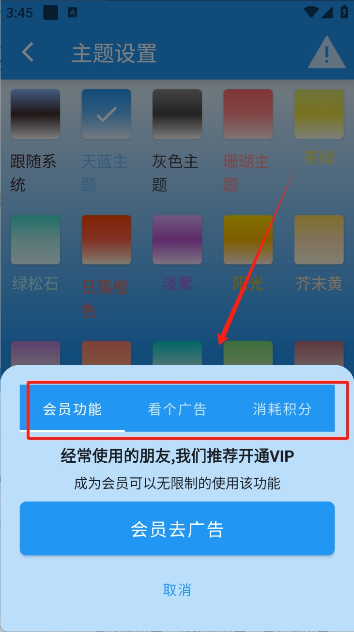 3、选择会员功能,点击“会员去广告”。开通VIP可享用无广告体验。
