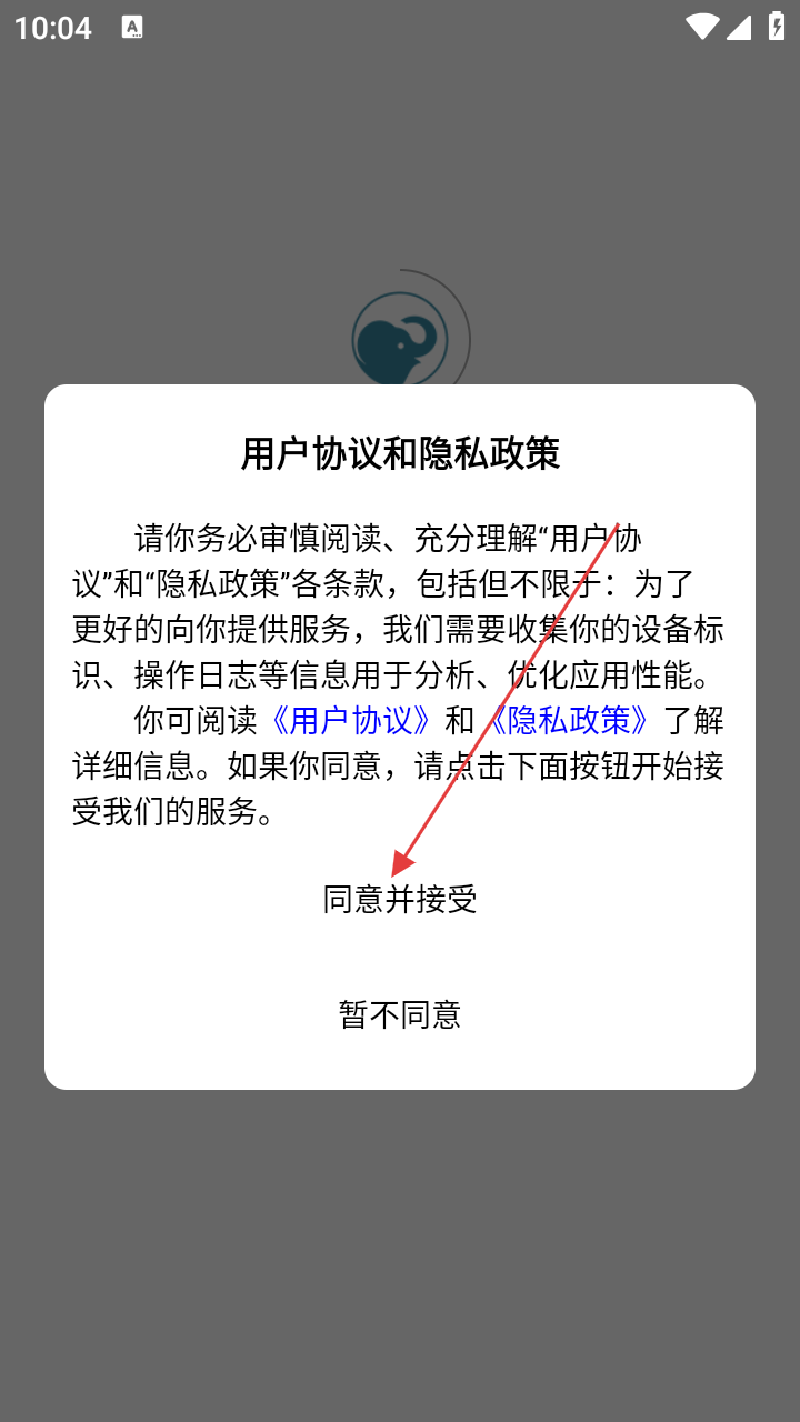 1、首次使用,在【用户协议和隐私政策】弹窗点【同意并接受】,进入登录页。