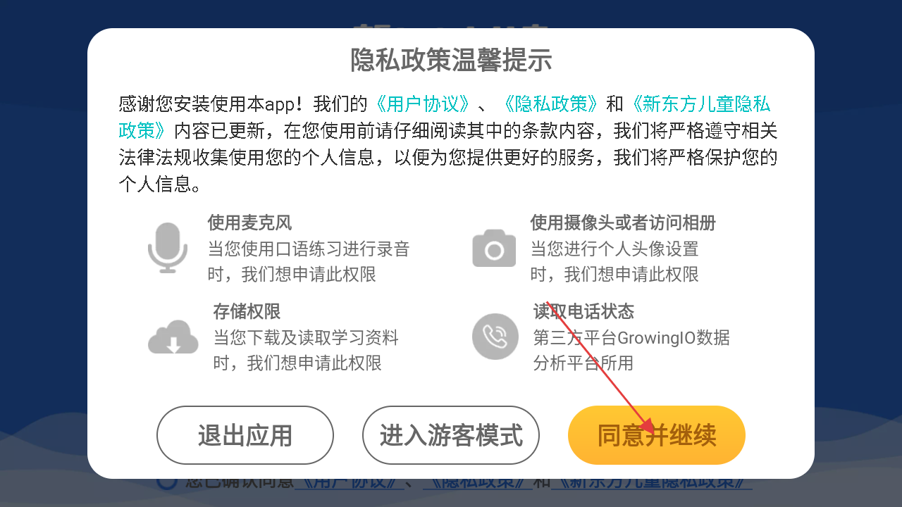 1、打开应用,在隐私政策温馨提示页面,点击【同意并继续】按钮,进入登录界面。