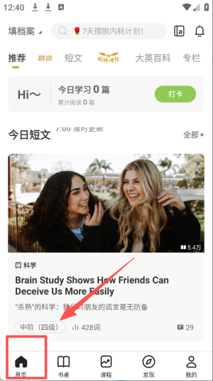 1、阅读短文,点击首页推荐的“今日短文”开始阅读并学习。