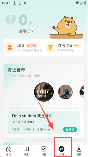 4、参与发现,点击“发现”图标,探索更多学习资源和活动。