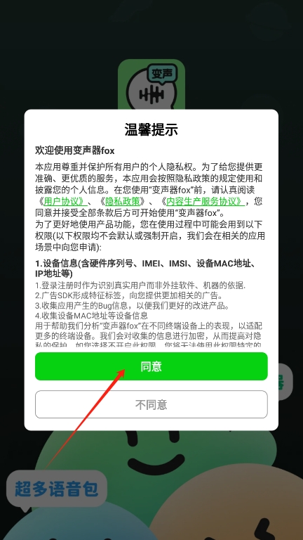 2、进入后阅读并同意变声器fox的用户协议