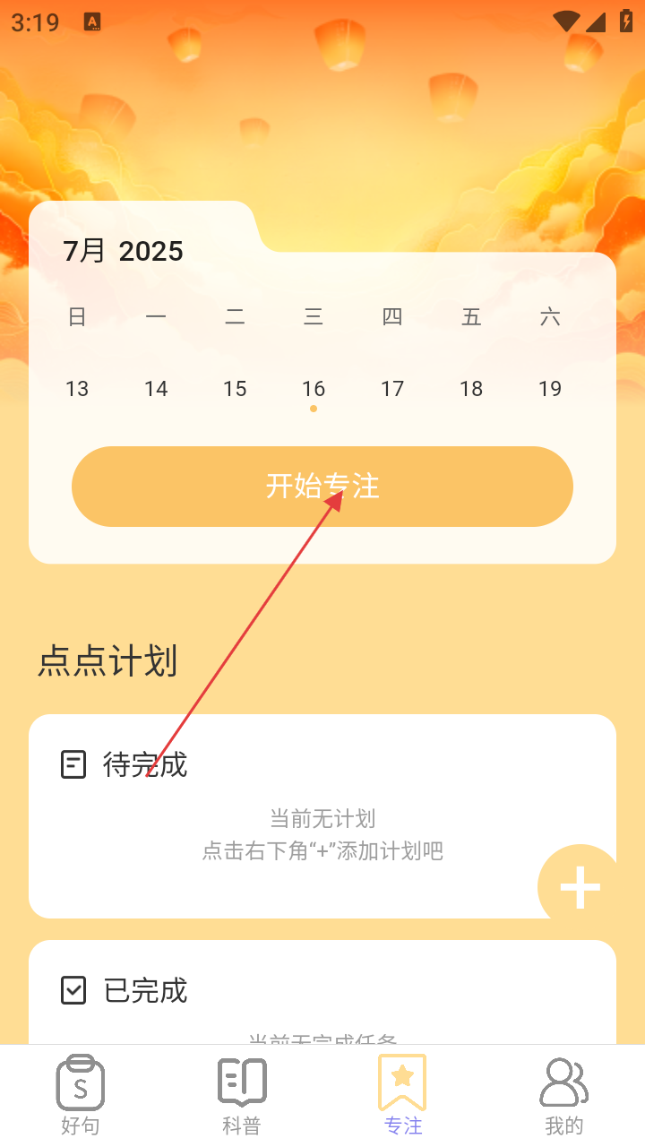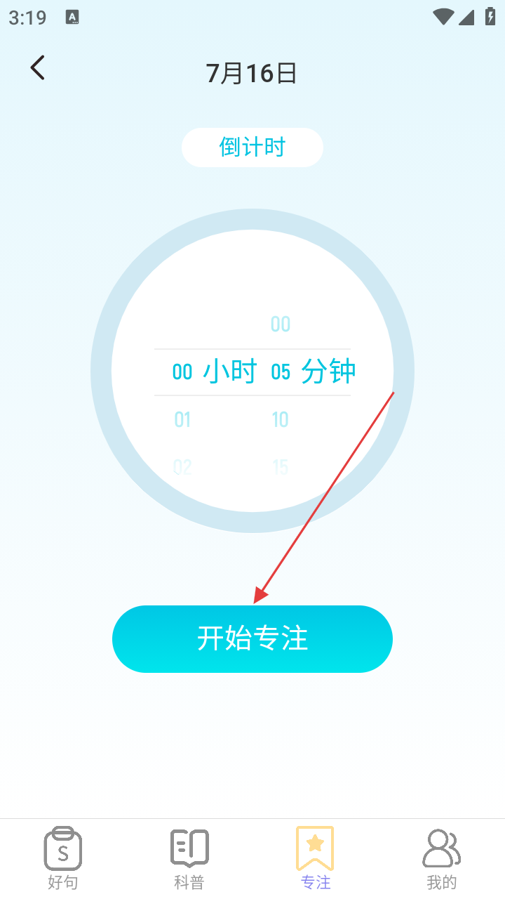 2、进入专注页,确认日期后,点击【开始专注】进入时长设置。