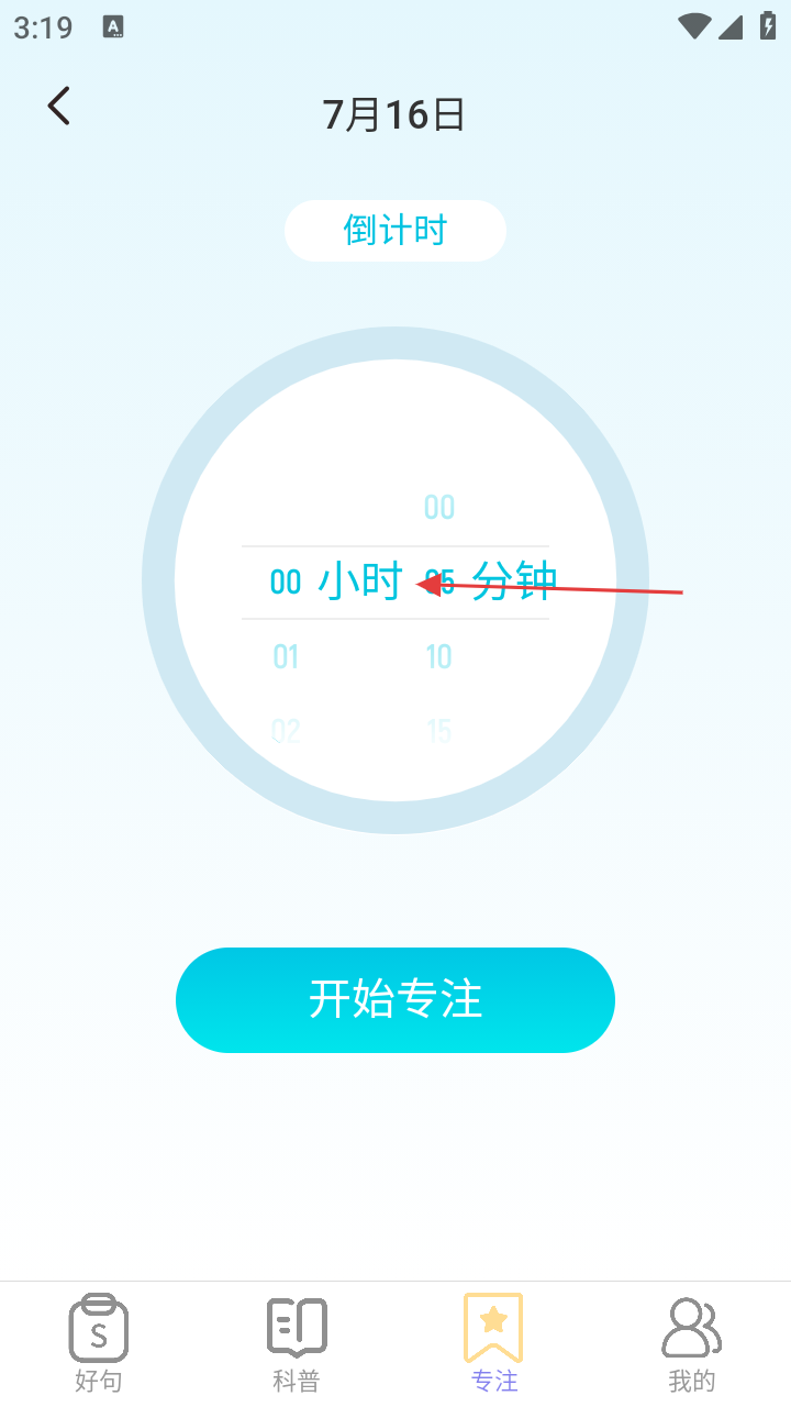 3、设置专注时长,可调整小时和分钟数值,按需设定专注时间。
