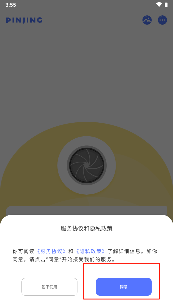 1、点击“同意”按钮,接受服务协议和隐私政策。