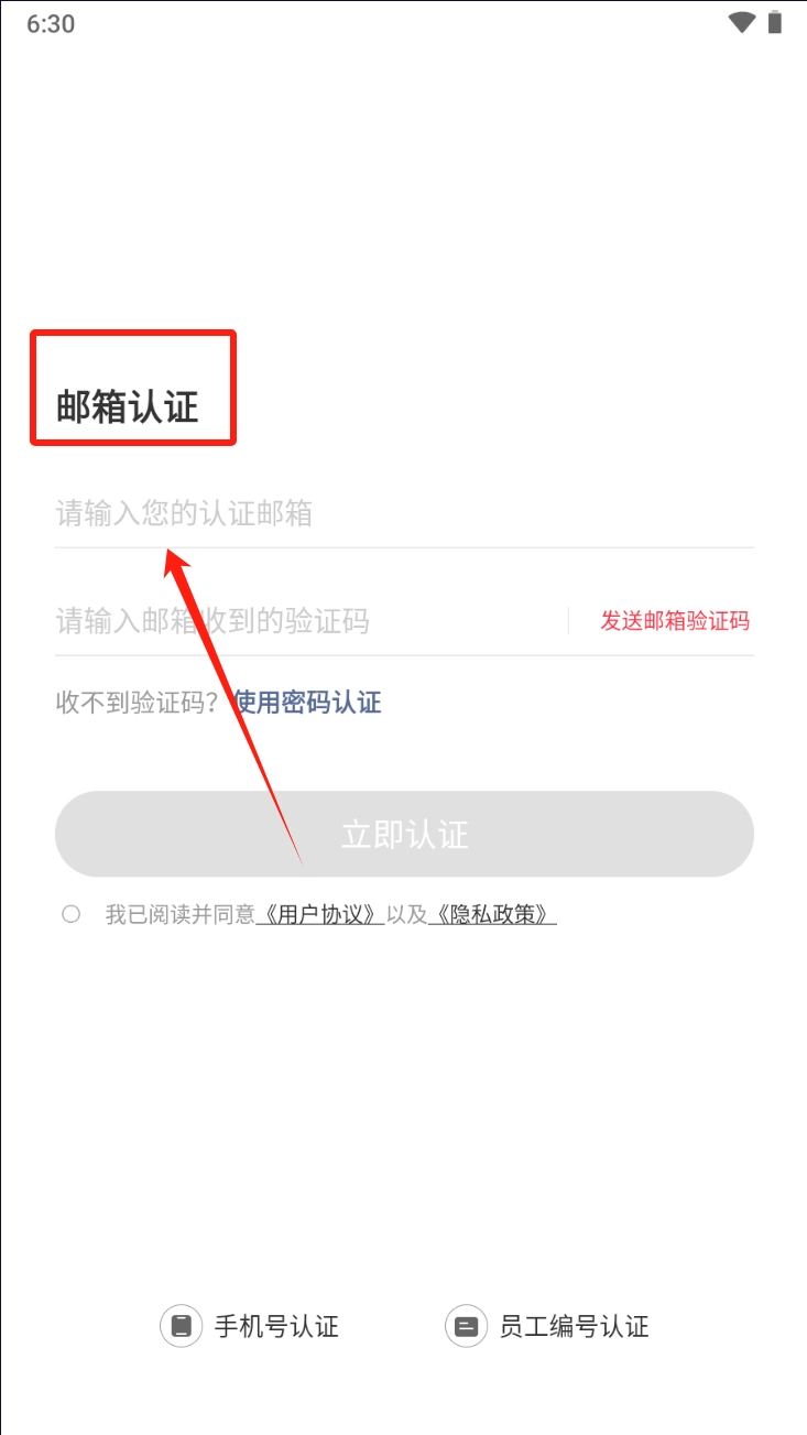 3、选择“邮箱认证”,输入邮箱地址并获取验证码,点击“立即认证”完成认证。