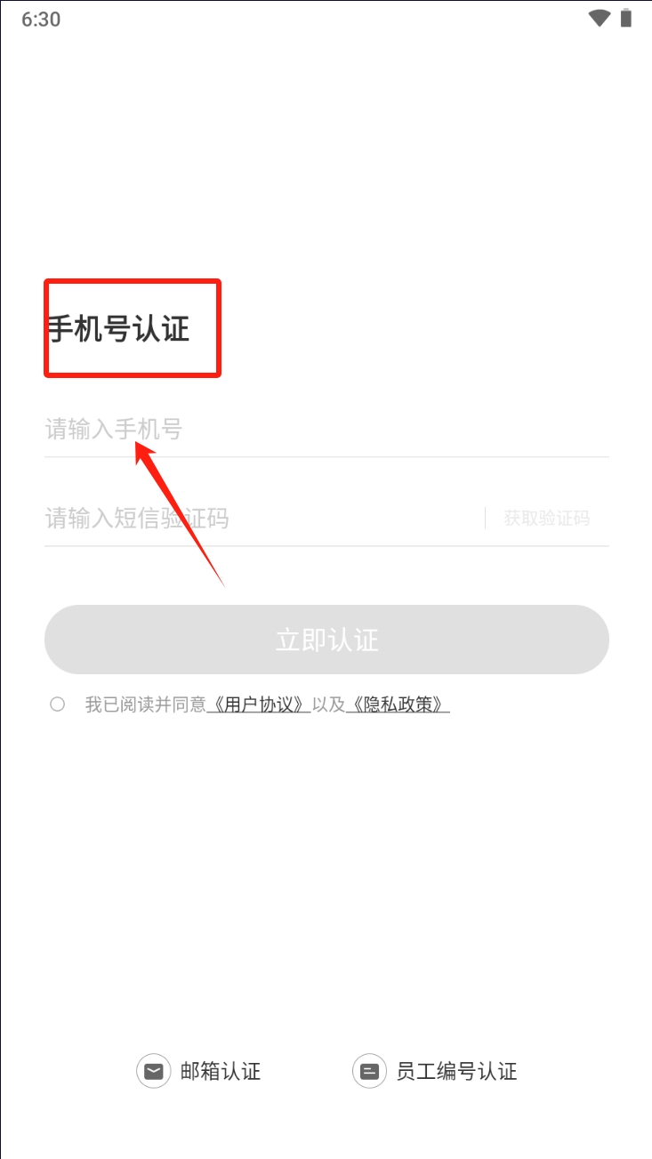 1、选择“手机号认证”,输入手机号并获取验证码,点击“立即认证”完成认证。