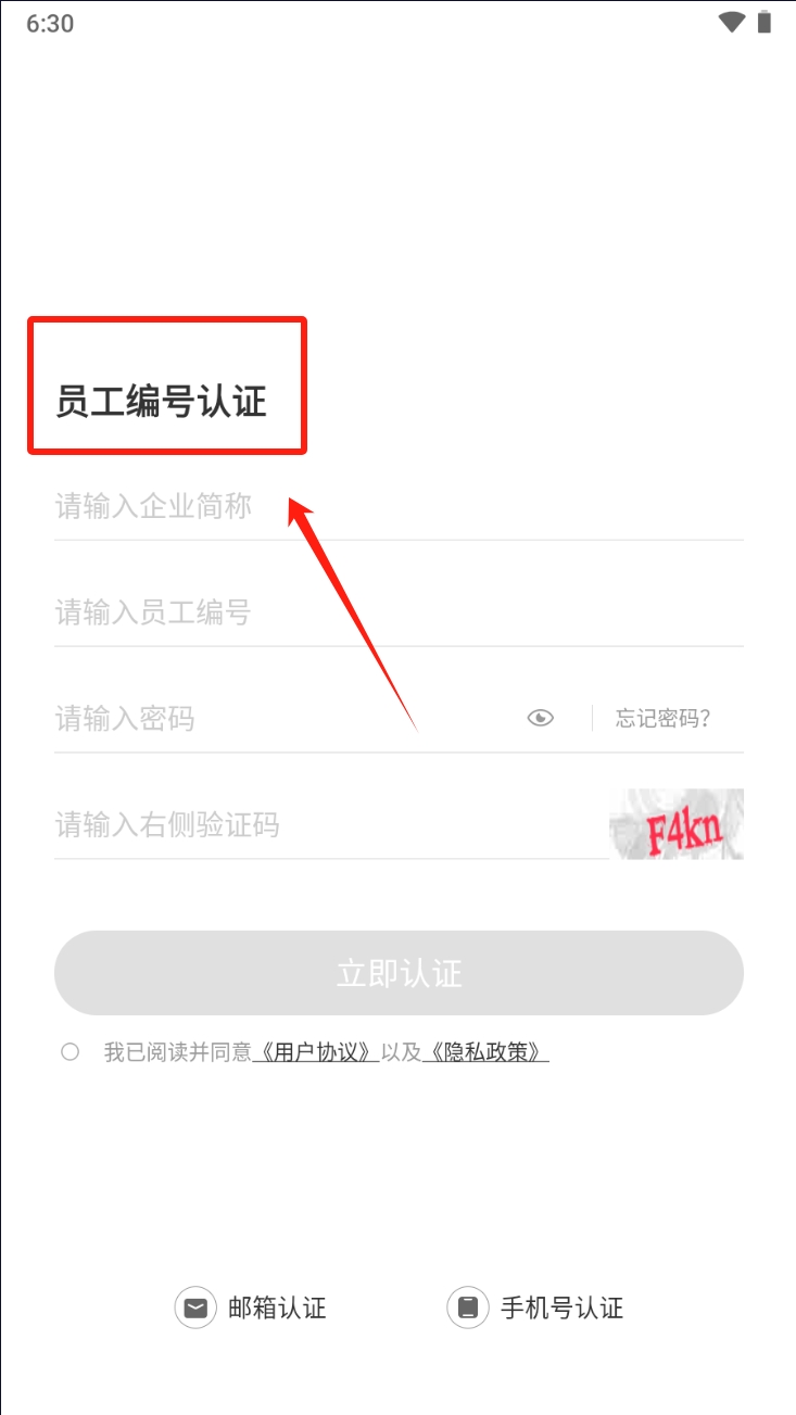 2、选择“员工编号认证”,输入企业简称、员工编号和密码,点击“立即认证”完成认证。