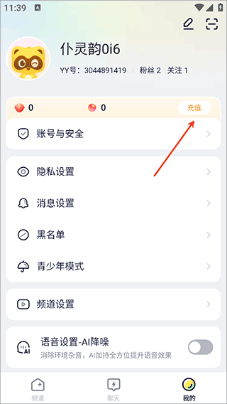 1、用户可以登录YY语音app后进入【我的】页面中点击【充值】