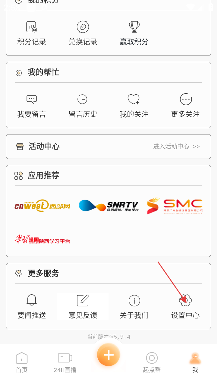 2、在个人页面,点击【设置中心】可进入系统设置界面,还能查看积分记录、参与活动等功能。