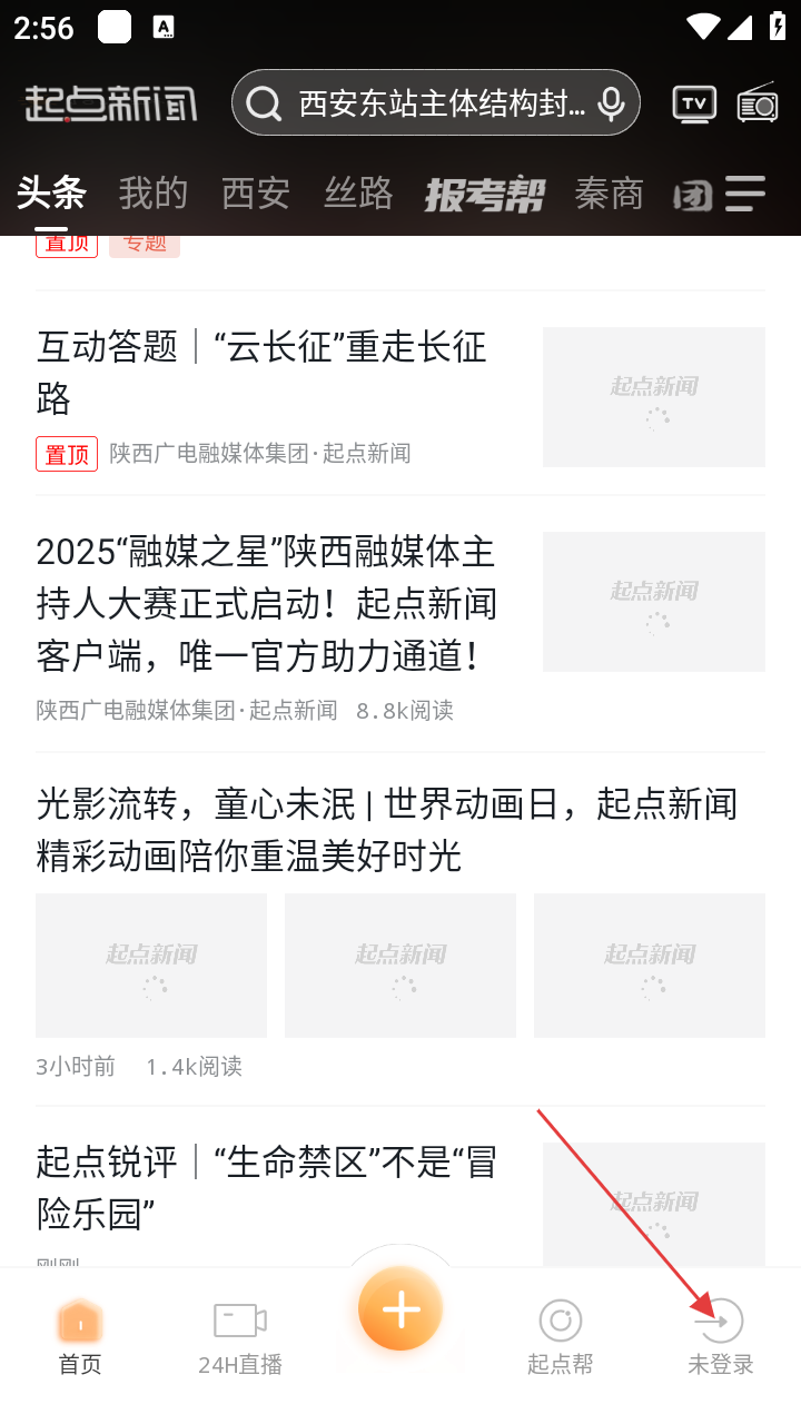 1、在起点新闻首页,可浏览各类新闻资讯,点击【未登录】进入个人相关页面,准备进行账号登录或功能设置操作。