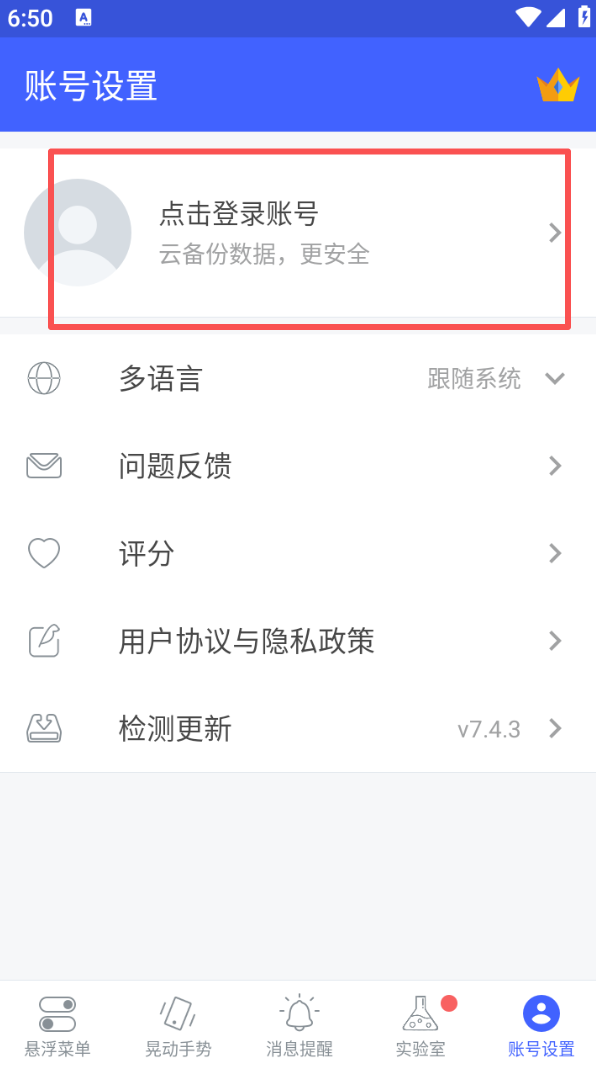 4、点击 “账号设置” 板块,可进行账号登录以实现数据云备份,同时能设置多语言、反馈问题、检测软件更新等操作。