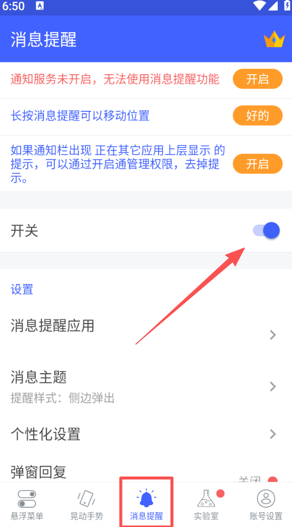 3、在 “消息提醒” 板块,开启 “开关” 后,还可对消息提醒的应用、主题及弹窗回复等进行个性化设置。