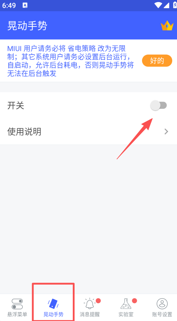 2、切换至 “晃动手势” 板块,将 “开关” 选项开启,同时留意系统省电策略的调整提示以确保功能正常触发。
