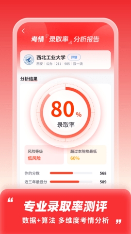 高考志愿填报助手是一款专为全国高考学子打造的志愿填报服务平台,借助AI智能和大数据功能为广大考生提供全方位的报考服务,一键查询院校信息,让你全方位了解高效的招生信息,并且该软件还有专业录取率测评,会做出多维度考情分析,参考价值还是挺高的。