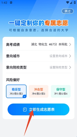 3、然后选择自己的意向城市、意向院校类型以及风险偏好,选择好后点击“立即生成志愿表”。